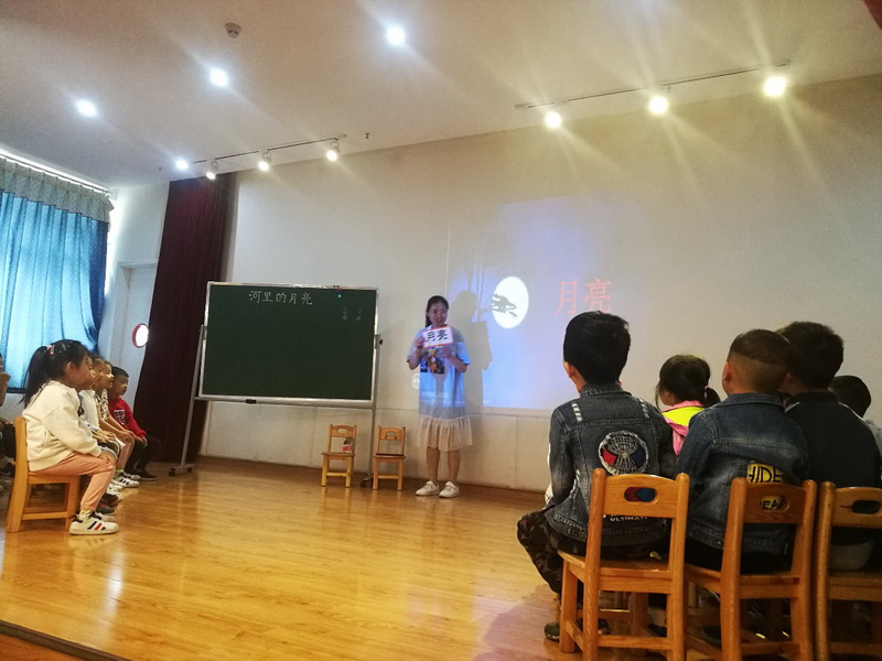 First, Mrs.Yang Fengjuan taught the "Moon in the River". Through pictures, she found that there is a moonin the sky and a moon in the river. Then, on the basis of children's cognition, she can feel the changes and beauty of the moon in the river through readingaloud. She used pictures to perceive the meanings of words such as "round,bright and broken" , at the same time, trained the accumulation of languageand words.