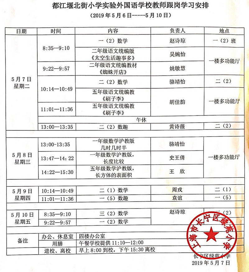On May 7th, the temperature dropped sharply, but our enthusiasm forlearning remained high. Early in the morning, our teachers were divided intotwo groups. They went to Shanghai Fudan Primary School and Shanghai GreenGarden Primary School to start a day's study.