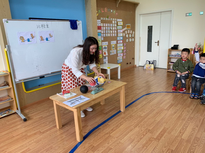 Wang Dongmei teacher's number game lesson "than weight",at the beginning of the class, the teacher out of the basketball and apple have deeply attracted the children, then the teacher said, hefted a hefted, weigh aweigh and other activities, gradually deepen the child's experience and understanding of the weight.