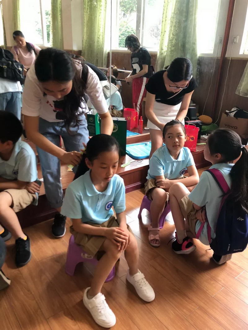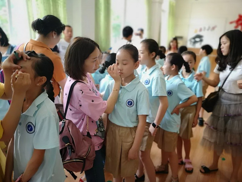 Children and parentscome to school early at the appointed time. Look, our parents take the initiative to help the children comb their hair, make up and change their clothes. They are very busy!