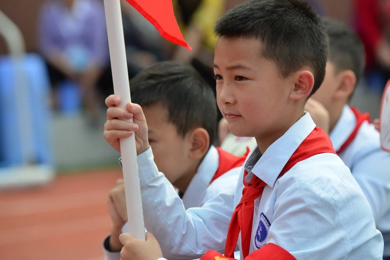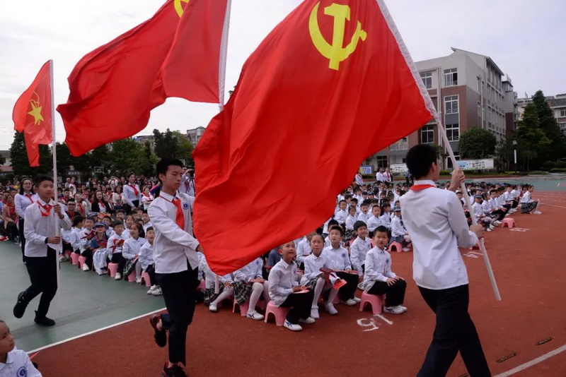 党旗、团旗、队旗在接班人的手里迎风飘扬。