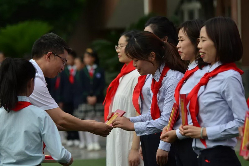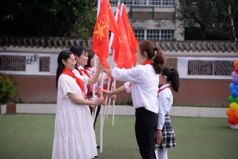 Announce the list of new counselor teachers, the old team members wear red scarves for the new counselor teachers, Director Ye issues letters of engagement for the new counselor teachers, and the team counselor teachers award squadron flags for the new counselor teachers.