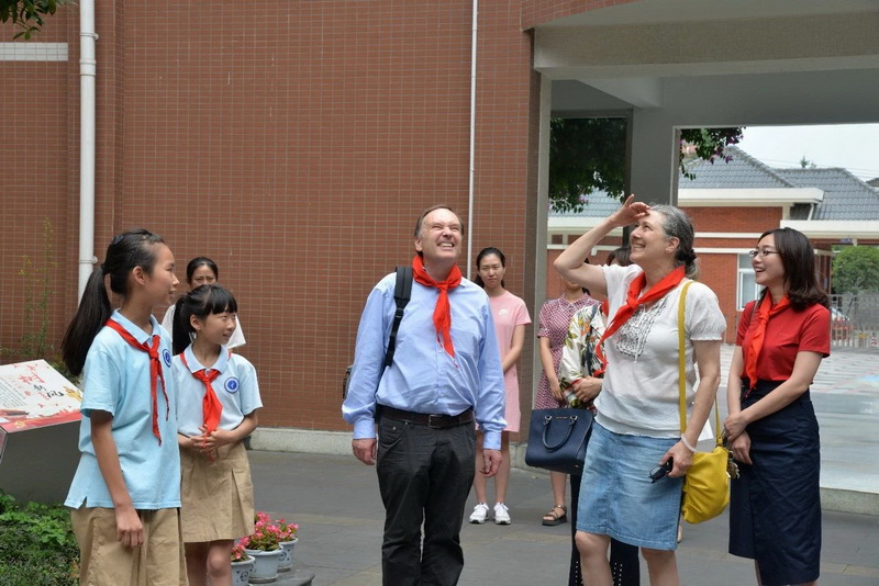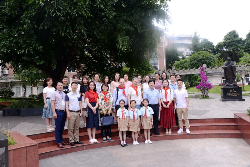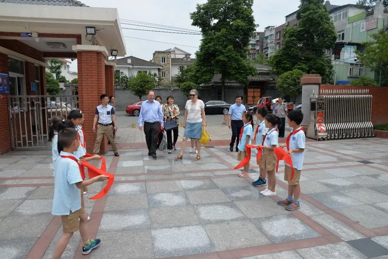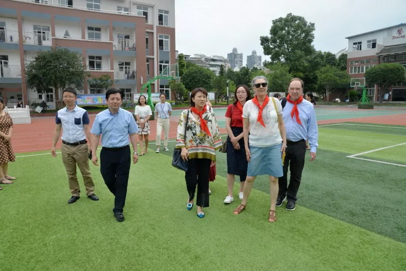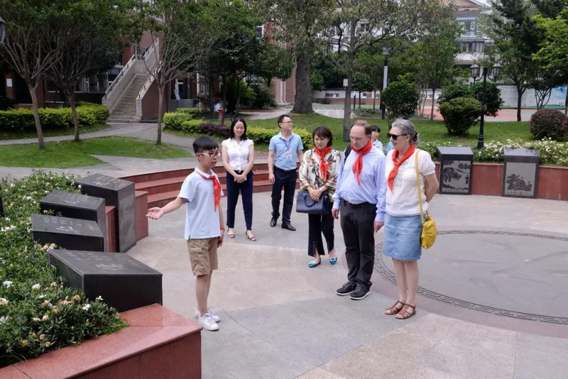 来宾们在都江堰市外宣部领导、我校校长及英语教师的陪同下参观了我校校园。来自我校各年级的学生为来宾们一一介绍我校校园环境及校园文化。