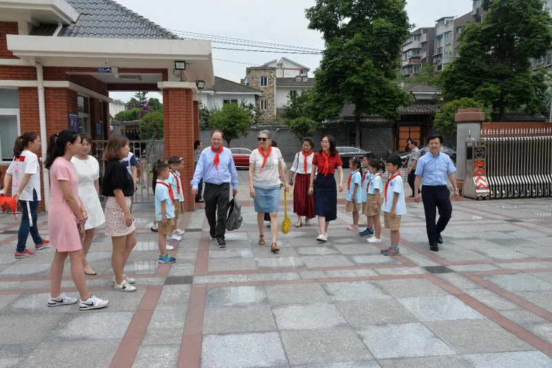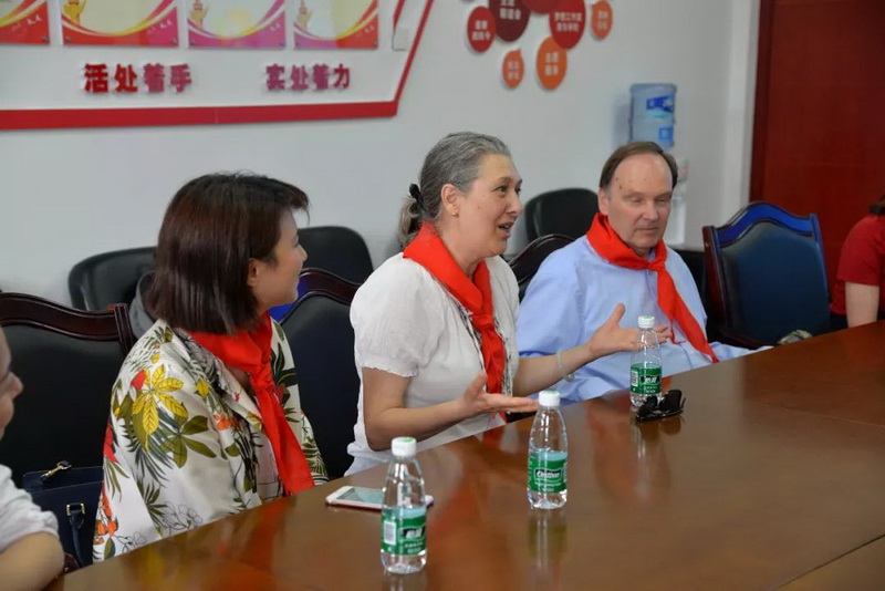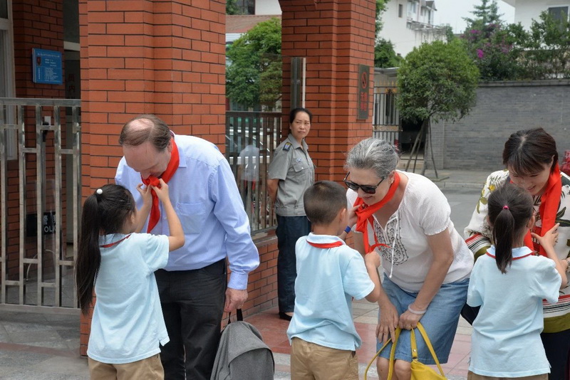 Children usefluent English to take their foreign guests to visit and experience. Everywherethey go, the guests listen attentively and praise our red scarf volunteers.