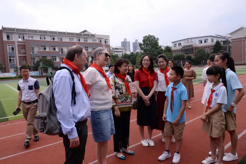 The guests visited our campus accompaniedby the leaders of Dujiangyan Municipal Government, the principal of our schooland English teachers. Students from all grades of our school introduce ourcampus environment and culture to the guests.