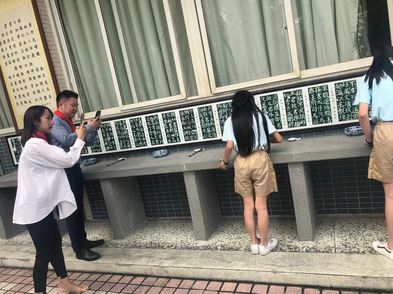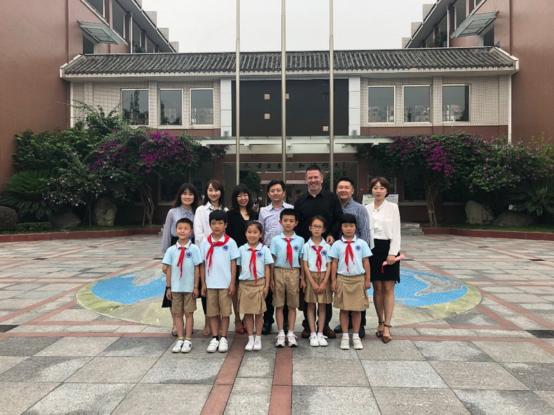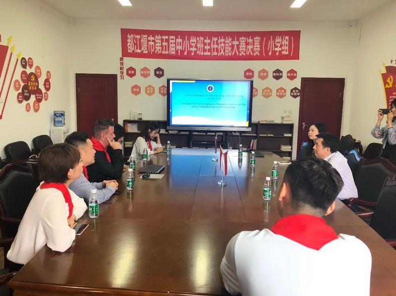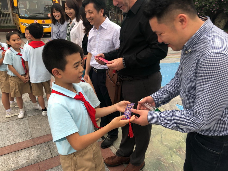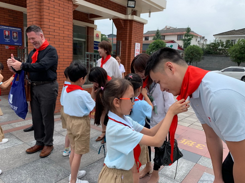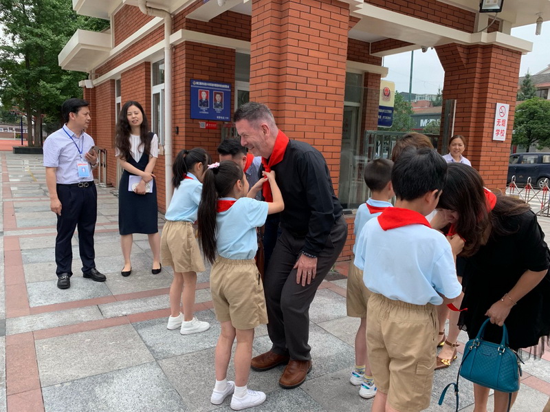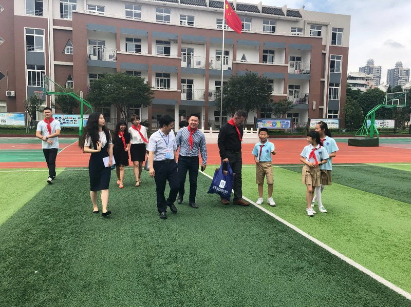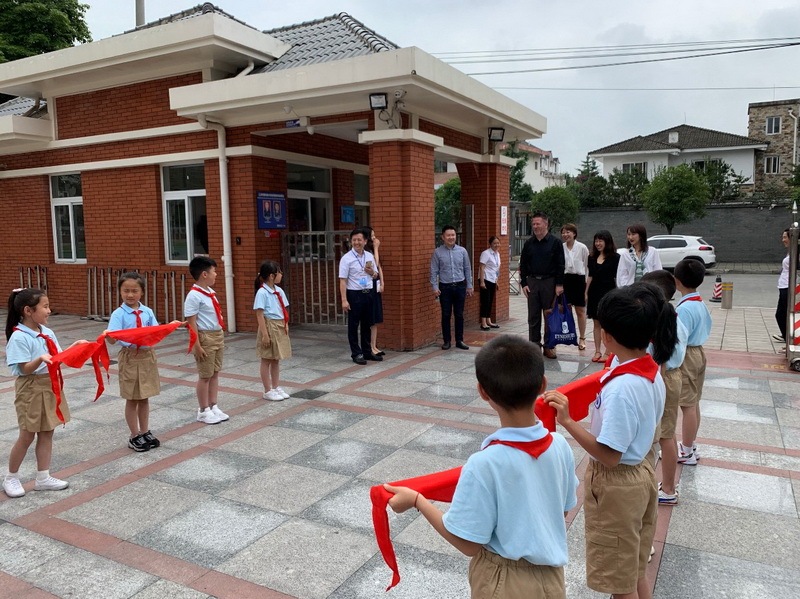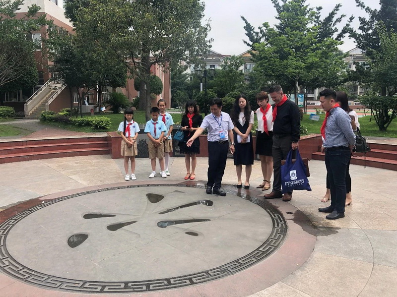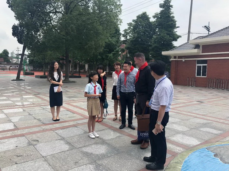 The guests visited the campus accompanied byheadmaster Ma. The red scarf volunteers from all grades introduced the schoolculture to the guests in fluent English.