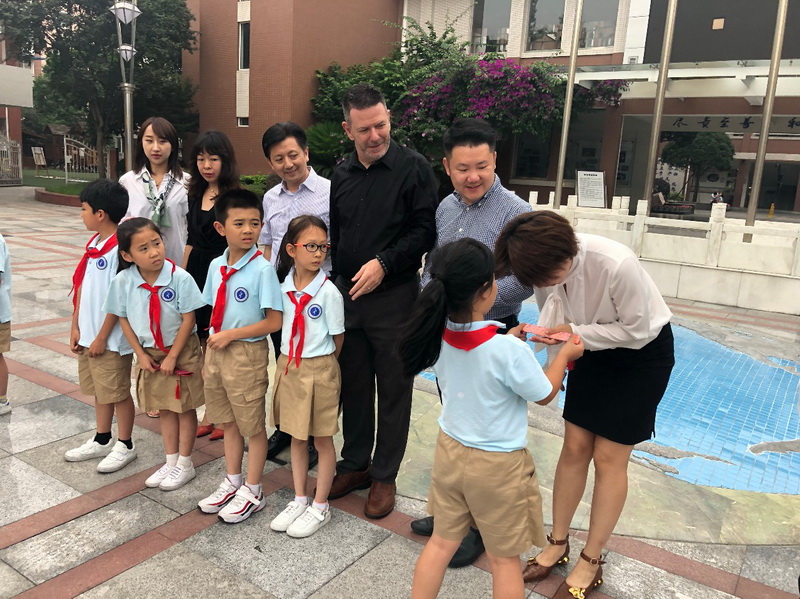 来宾们在马校长的陪同下参观校园,来自各年级的红领巾志愿者们用流利的英文为来宾介绍学校文化。