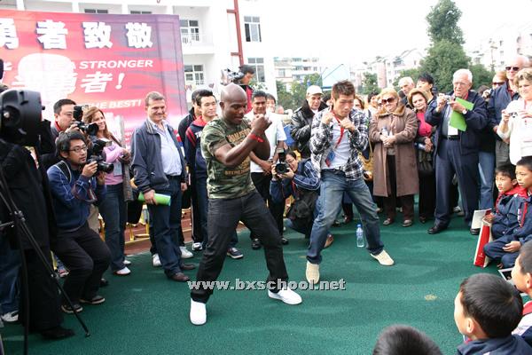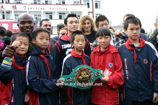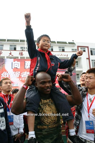 WBC将金腰带送给了我校,孩子们争相伸手抚摸金腰带,希望能从中吸取勇敢的力量。三位拳手还现场为学生们做拳击动作示范,并与同学们做简单的“较量”。