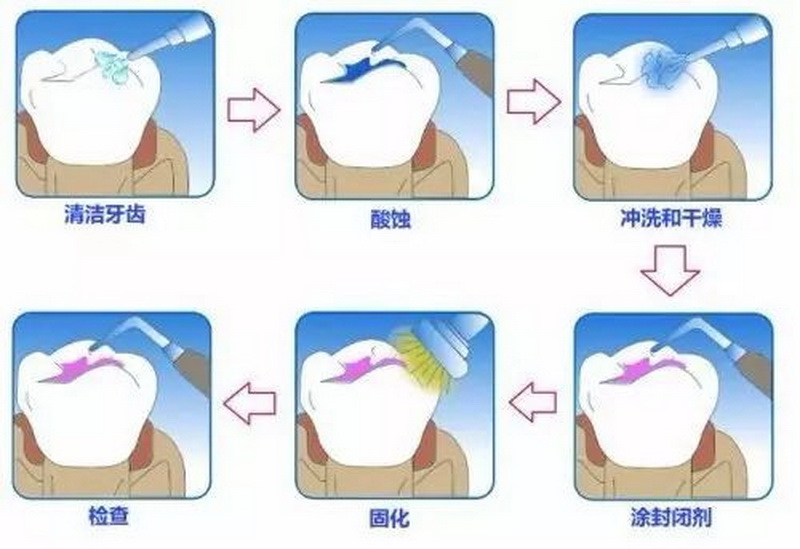 窝沟封闭是指不损伤牙体组织,将窝沟封闭材料涂布于牙冠咬合面、颊舌面的窝沟点隙,当它流入并渗透窝沟后固化变硬,形成一层保护性的屏障,覆盖在窝沟上,能够阻止致龋菌及酸性代谢产物对牙体的侵蚀,以达到预防窝沟龋的方法。窝沟封闭是一种无痛、无创伤的预防方法。Sealing pit and fissure is a method to prevent dental caries by preventing the erosion of cariogenic bacteria and acid metabolites. Pit and fissure closure is a painless and non-invasive method of prevention.