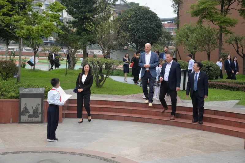 来宾们在都江堰市外事办领导、马校长及英语教师的陪同下参观了校园。红领巾志愿者用流利的英语为来宾一一介绍我校校园文化。