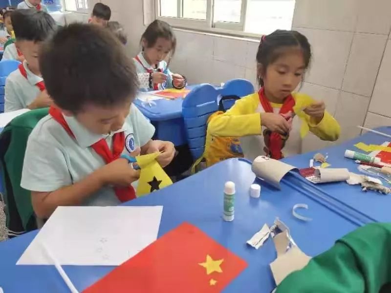 On the occasion of celebrating the70th anniversary of our motherland, Lai Yaxuan's father from class 3 grade 2 tookhis children to do something very meaningful -- try to make a national flag byhimself to express his love for our great motherland.