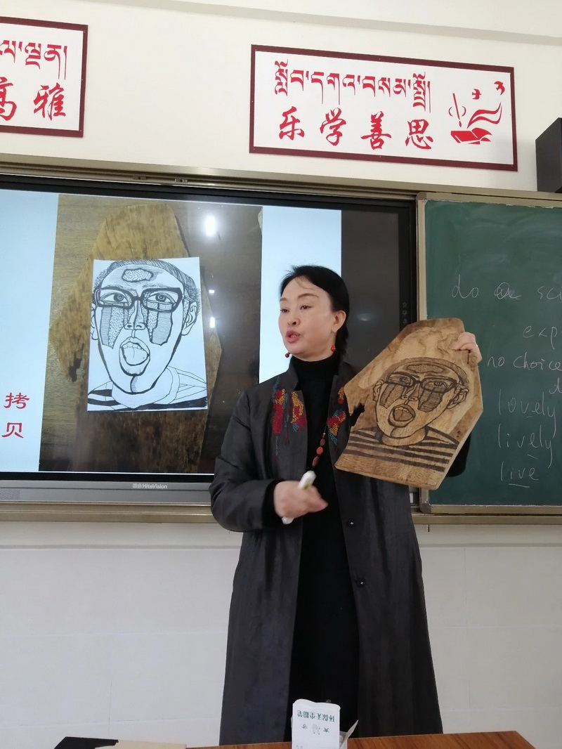 四位献课老师从国画、线描、油画棒、黏土、热缩片等方面,给藏区的孩子上了几堂别开生面的美术课。