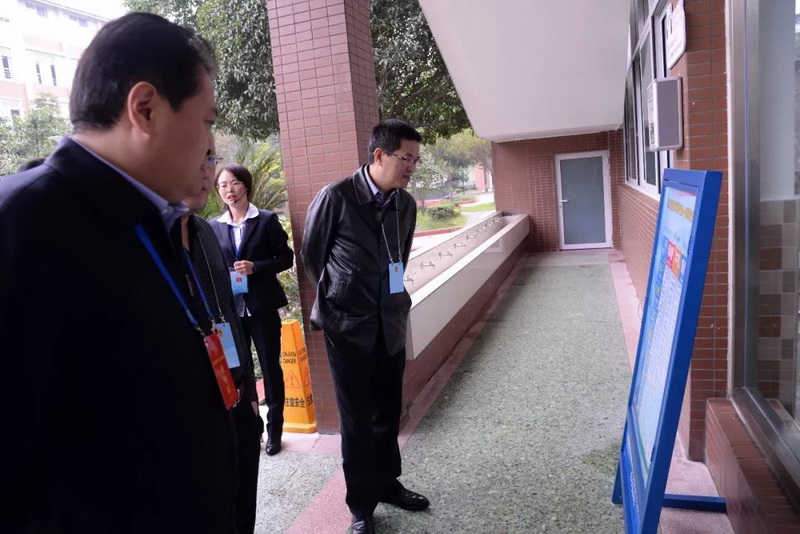 On October 21st, under the leadership of Wang Cong, director of the Committee of Dujiangyan Municipal People's Congress, and Yuan Ming, deputy mayor of Dujiangyan Municipal People's Congress, the leaders of Dujiangyan Municipal People's Congress Standing Committee, people's government and Economic Committee of Dujiangyan Municipal People's Congress visited our school to check the implementation of the food safety law of the people's Republic of China and the "Promotion demonstration of standardized and refined menu signs in catering industry". Zhou Liejian, President of the school, Hu Tao, vice principal of school and Wu Yong, director of the food safety office accompanied the inspection.