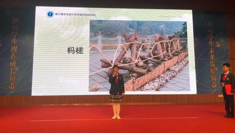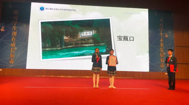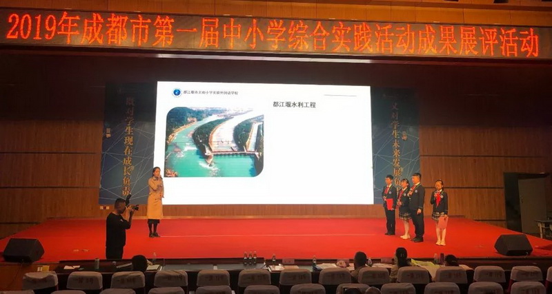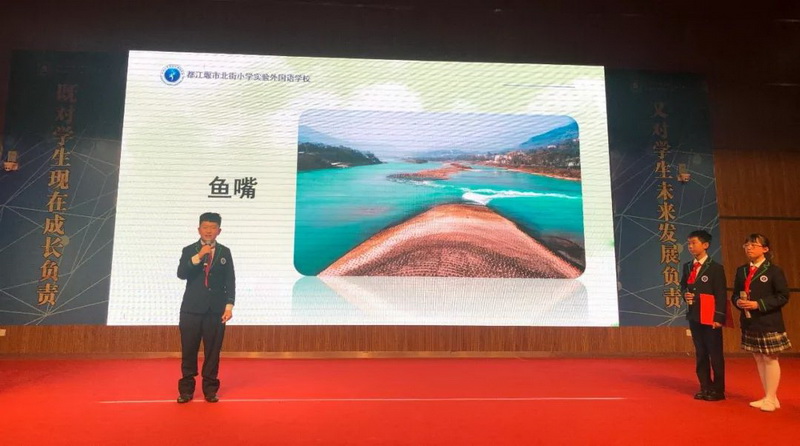 Cai Man, a teacher of our school, and four fifth grade students made a presentation on the theme of "the new exploration tour of Guyan", a special research travel course of our school, and the restoration of the world irrigation project heritage.
