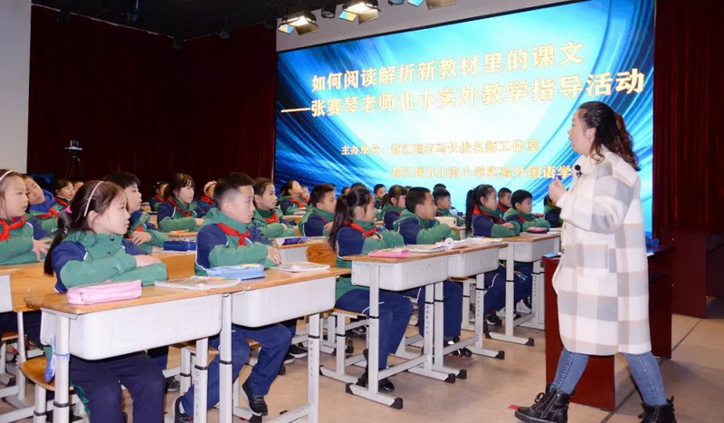 On December 2, 2019,Ms.Zhang Saiqin, Ms.Song from the teaching and Research Office, and Ms. Ren from the teaching and research office to carry out the theme seminar activity" how to read and analyze the text in the new textbook",who are invited by master studio and our school.This meeting was strongly supported by the teaching and research office and the teachers' training school. More than 120 teaches from primary schools in the city attended this meeting.