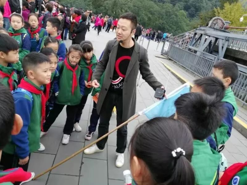 Parents accompany children into the great historic site Dujiangyan water conservancy project