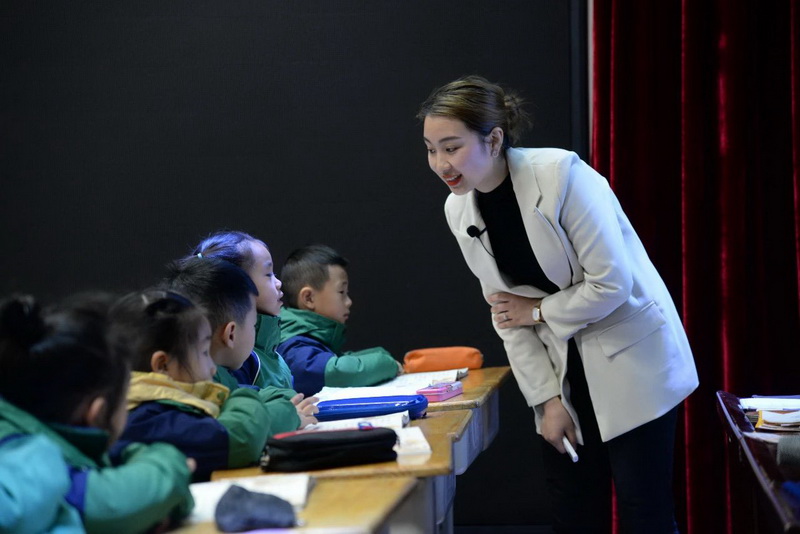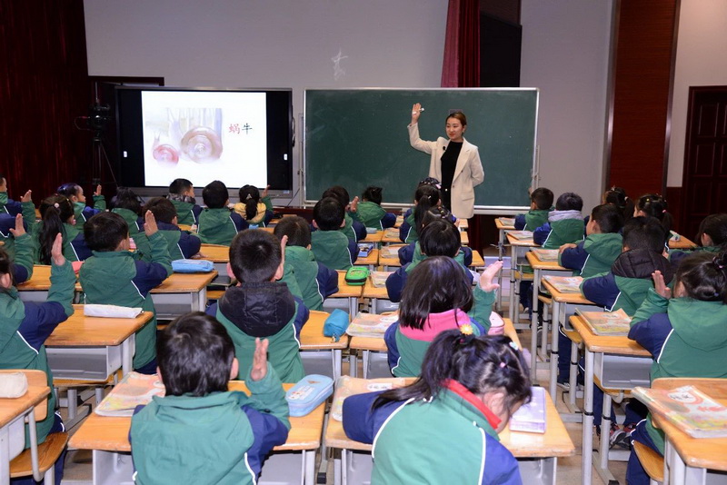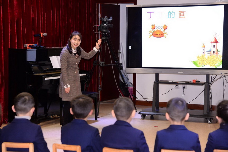 Cao Shan, a Chinese teacher in our school, shows the first grade Chinese lesson "Little snail" and Wang Zhen, a music teacher, shows the big class "Careless little painter" in the kindergarten.