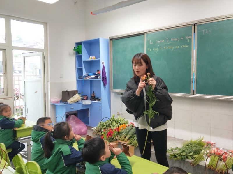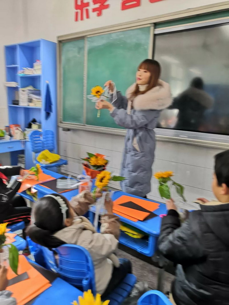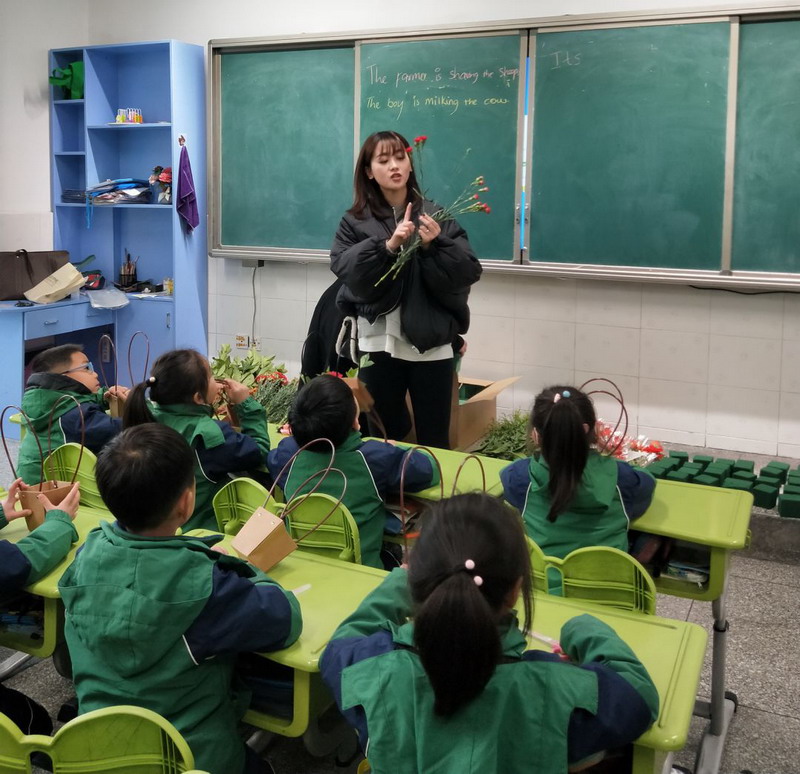 Chen Yashi’s mother took a large bouquet ofsunflowers into the classroom. In her lesson, the children learned to tieflowers, they’re very happy.
