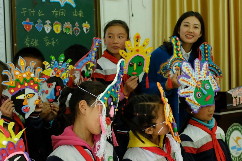 王丽老师:应四川省教育科学研究院邀请,送教到甘孜道孚,上课《藏戏面具》获得好评。