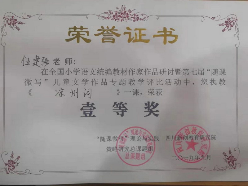 伍建强老师:全国小学语文统编教材作家作品研讨暨第7届随课微写儿童文学作品专题教学评比活动,执教《凉州词》,获得一等奖