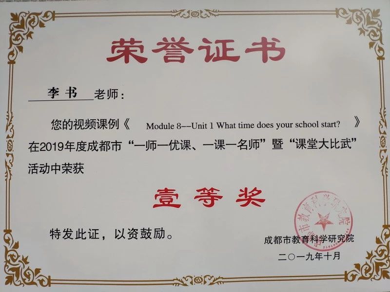 李书老师:成都市一师一优课暨课堂大比武,录像课《What time does your school start?》获得一等奖Li Shu: First prize of videocourse "what time does your school start?".