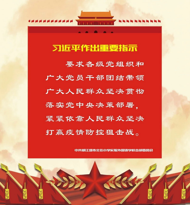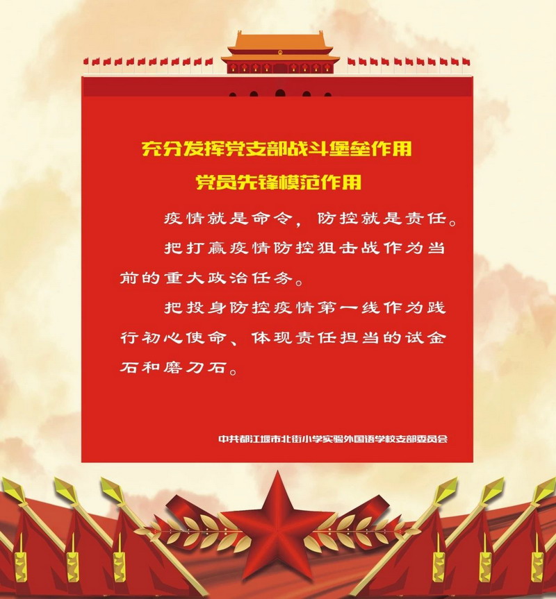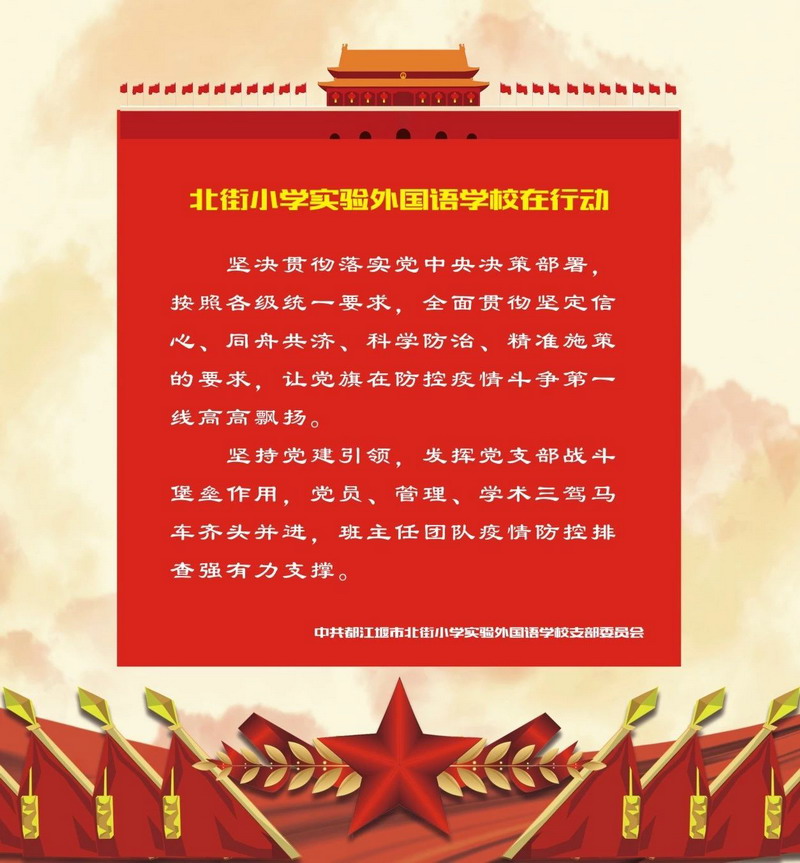 近日,为加强目前新型冠状病毒感染肺炎疫情的有效防控,中共北街小学实验外国语学校支部委员会充分发挥基层党组织战斗堡垒作用和党员先锋模范作用,迅速组织开展“我是党员,我承诺”倡议活动,带动全校教职员工从班级线、教师线、职工线、行政管理线全方位联防联控、群防群控,日日追踪、人人排查,无缝隙地对全校师生进行疫情防控管理。