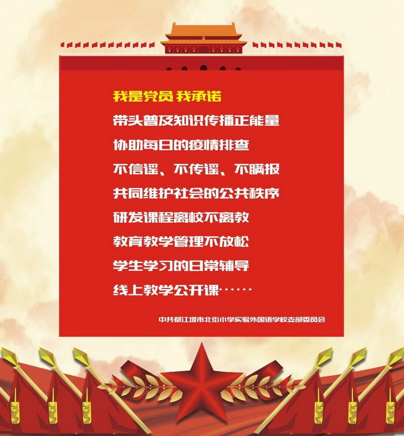 Recently, in order to strengthen the effective prevention and control of the current new coronavirus infection pneumonia epidemic situation, the branch committee of the Beijie Experimental Foreign Language School of the Communist Party of China gave full play to the role of the grass-roots party organizations as battle fortresses and the vanguard and exemplary role of Party members, quickly organized and carried out the "I am a party member, I promise!" initiative activity, and drove the faculty and staff of the school from the class line, the teacher line, the staff line and the administrative line All round joint prevention and control, group prevention and control, daily tracking, everyone's investigation, seamless epidemic prevention and control management for teachers and students in the school.