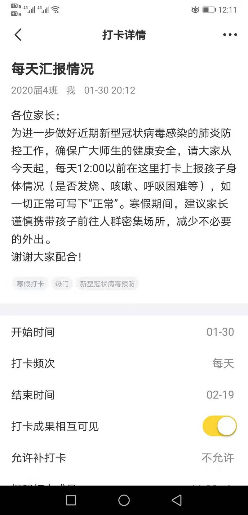 学校统一规定作息时间,为孩子们制定了《在家学习课表与生活指南》,拟以“晓黑板”打卡、讨论、教师在线授课、答疑等方式,让每一个孩子在家生活规律化、时间安排合理化、学习内容定量化、学习效率可测化。