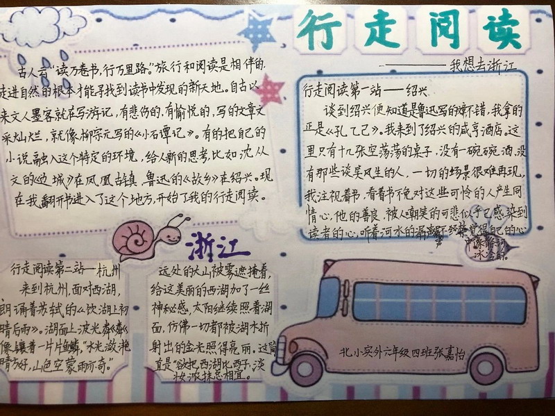 3.“行走阅读”换个样:将自己本想去实地考察的地方,改为网上查阅资料,认真阅读,细致了解,完成一份“我最想去的地方”小报。