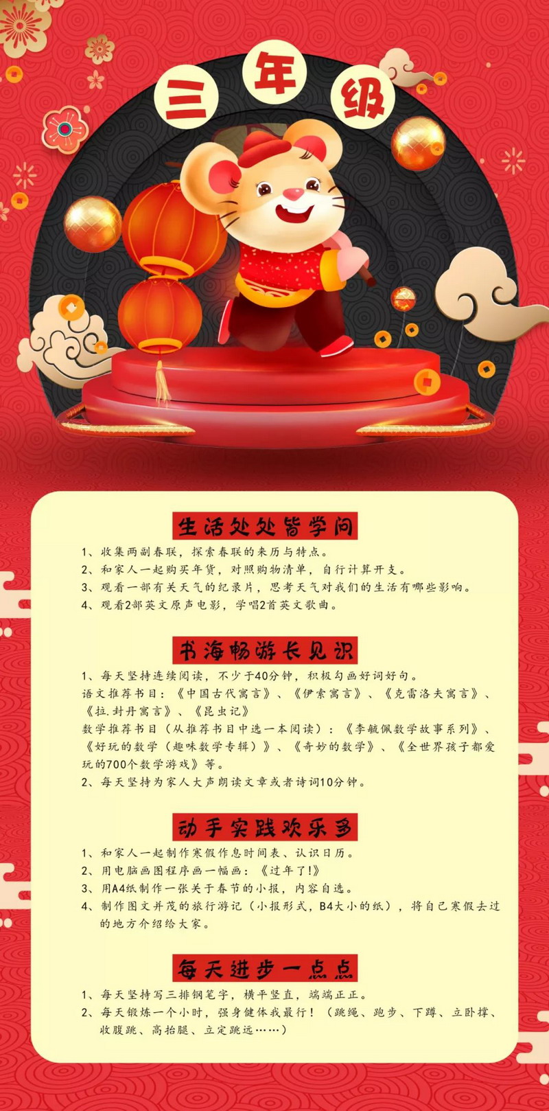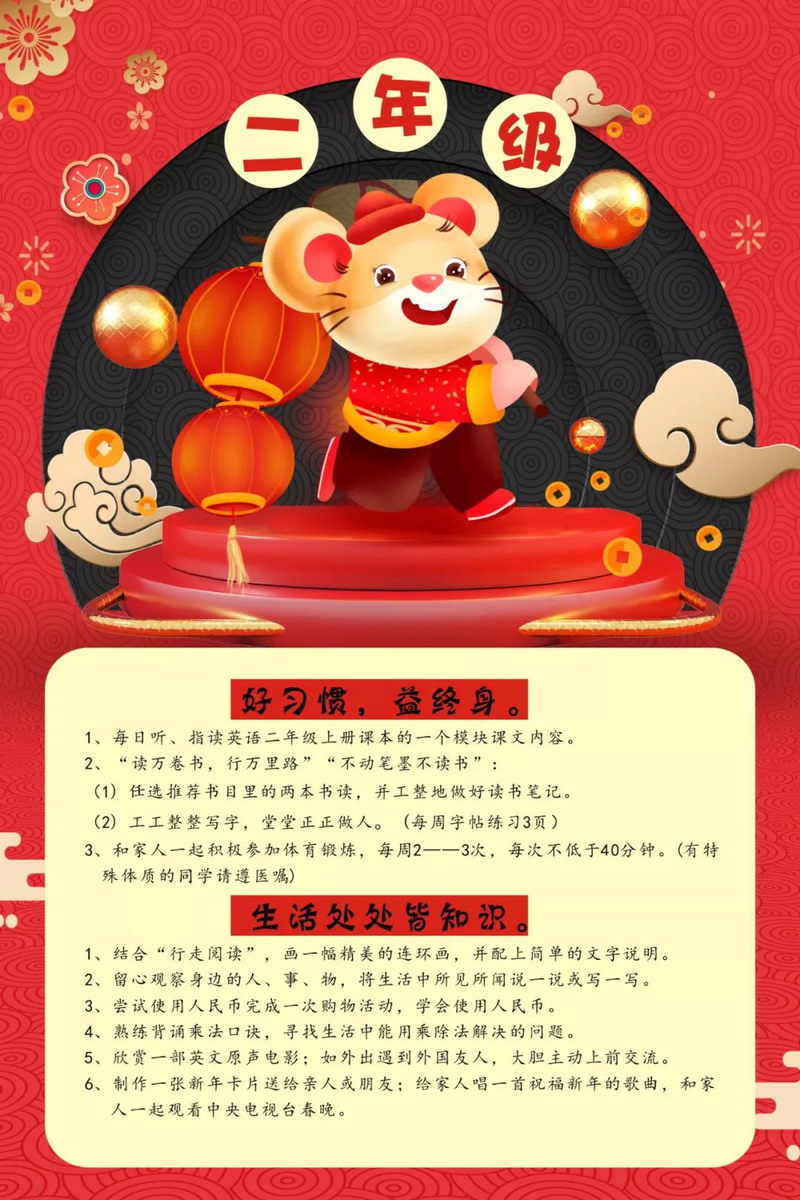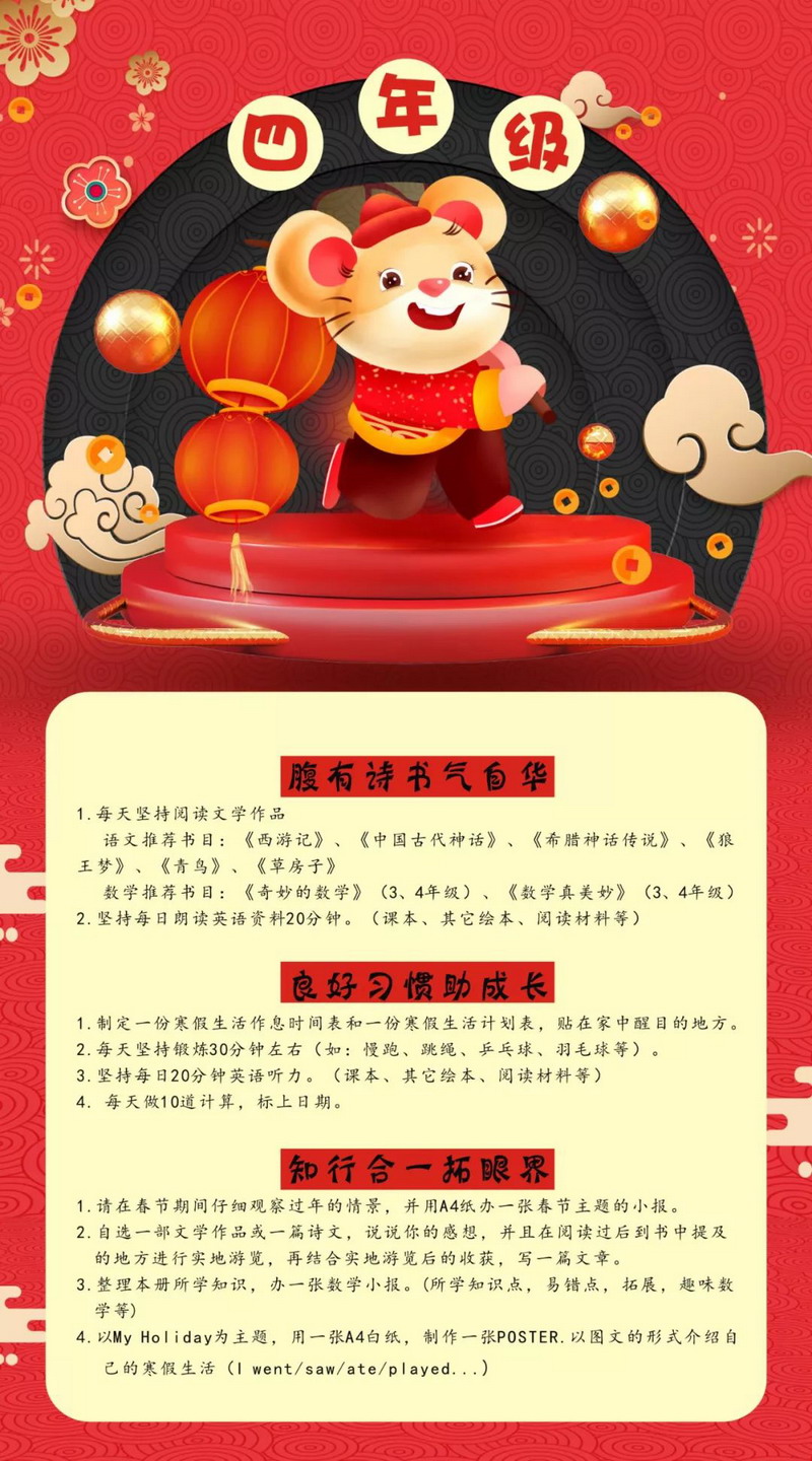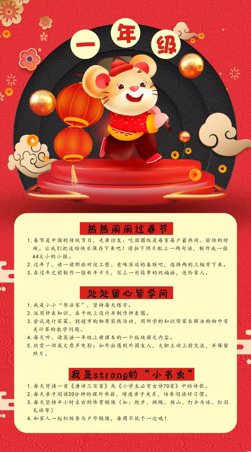 4.《寒假指南》不打折:按照各年级寒假生活指南,每个孩子扎扎实实完成相应学科的学习课程,实践课程、创作课程,开学参加班级评比。