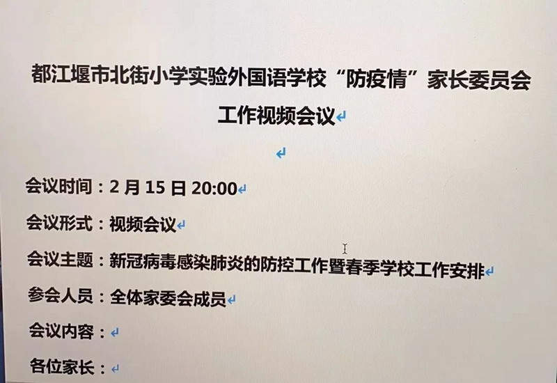 In order torealize the home-school communication and form the joint force of schooleducation and family education, we will do a good job in the prevention andcontrol of the new coronavirus infection pneumonia epidemic in special periodand arrange the school work in spring. On February 16th, our school organized avideo conference of "epidemic prevention" parents committee.