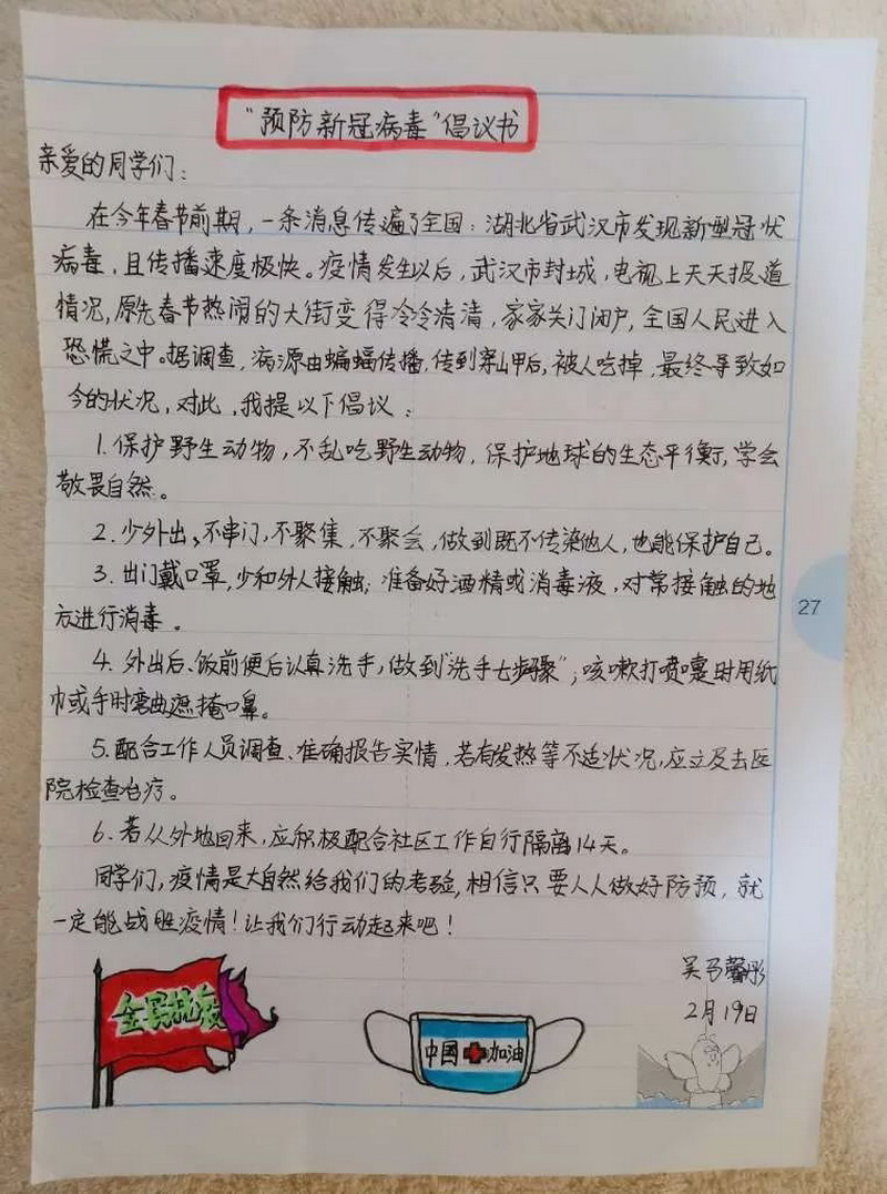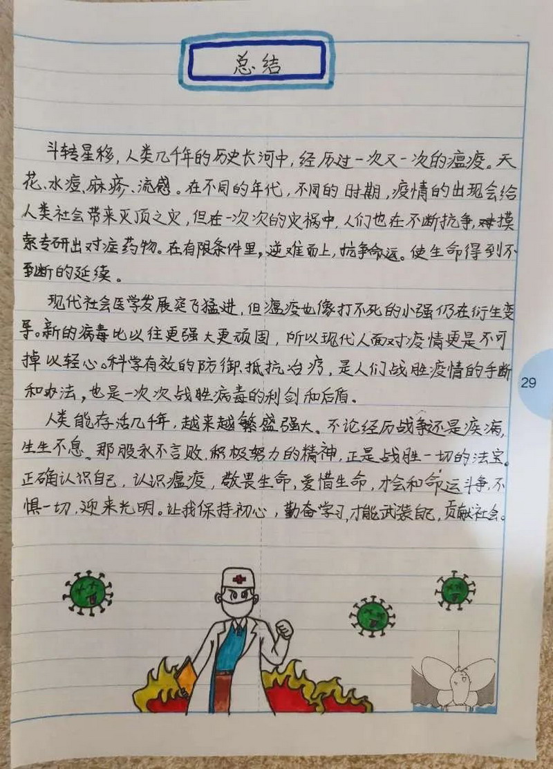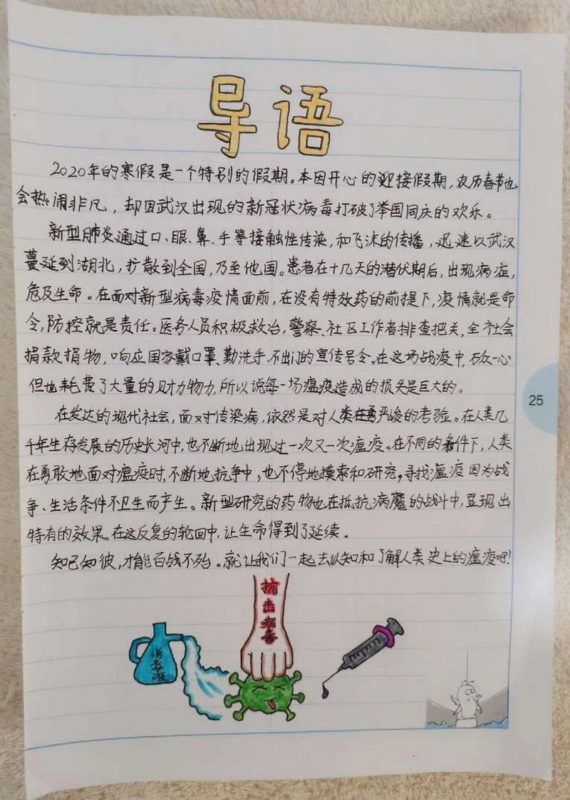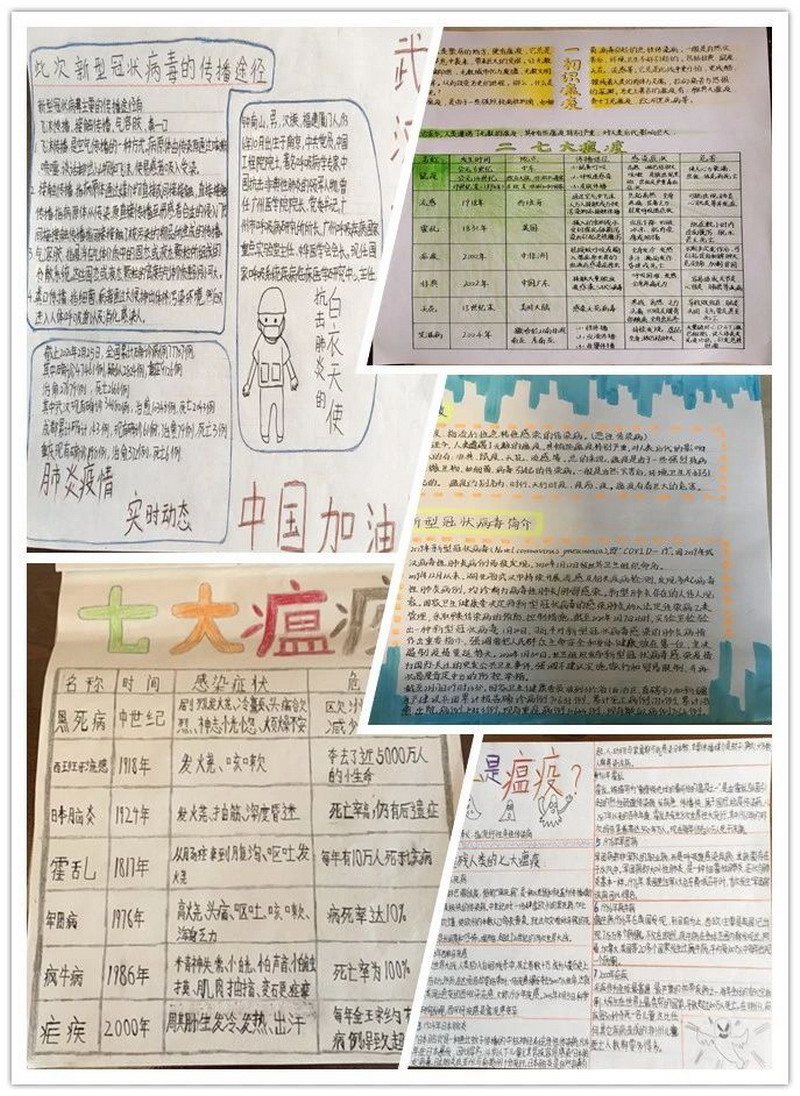 The winter , we had the most unforgettable holiday ever. The new corona virus has brought us a disaster and caused people a lot of thinking. The sixth grade children had a deep understanding and thinking about the virus and made a collection. In the course of the investigation, the children sincerely sent out a letter of proposal, and could not help but express their respect for the war heroes by writing letter of thanks and painting. The war "epidemic" let the children mature and grow up.
