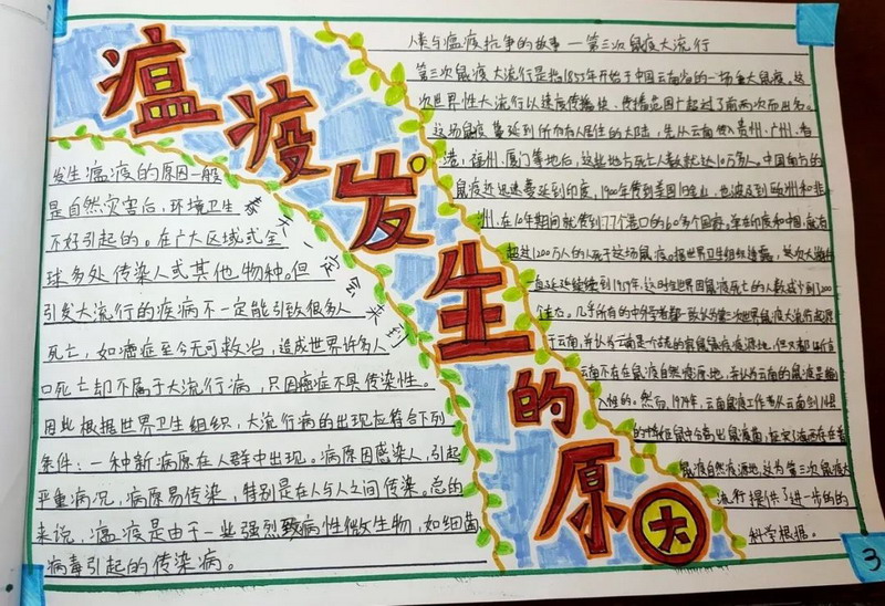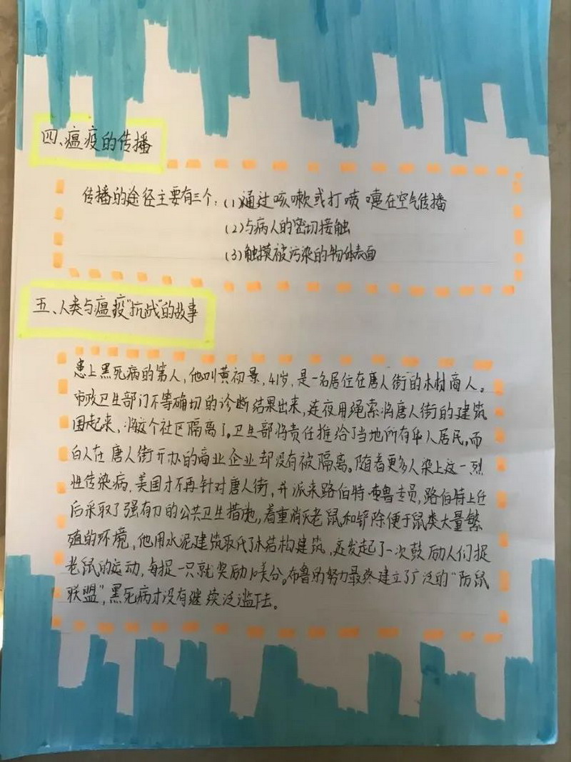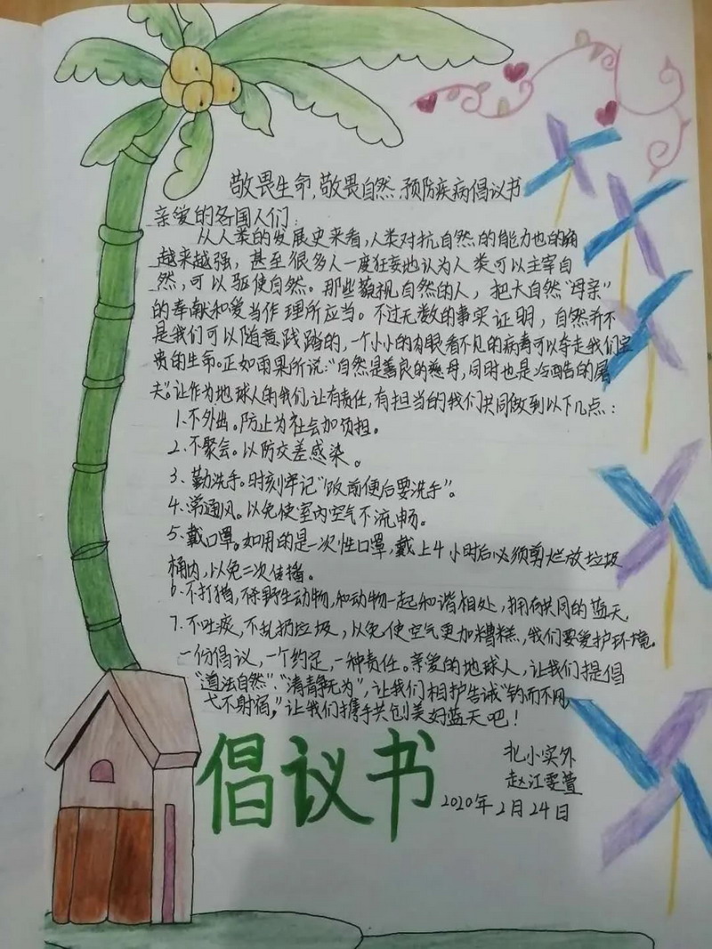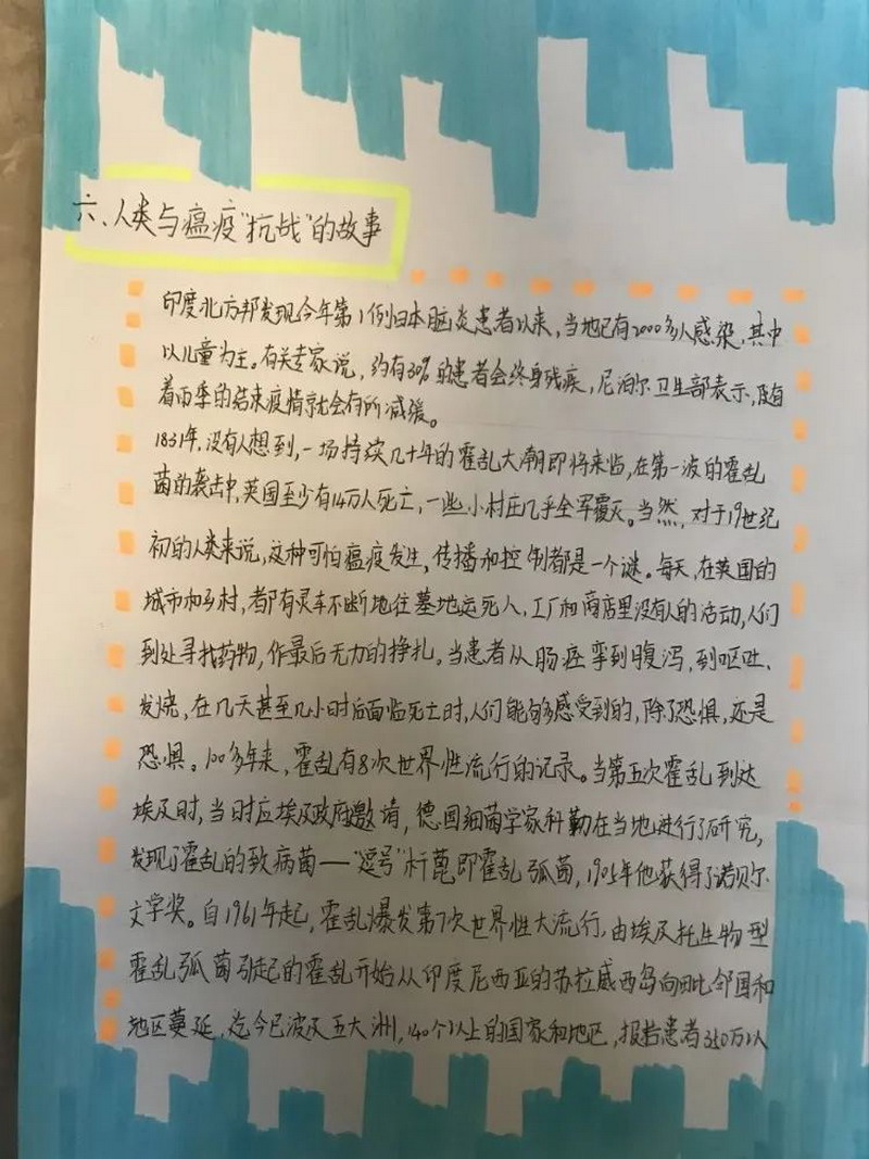 The winter , we had the most unforgettable holiday ever. The new corona virus has brought us a disaster and caused people a lot of thinking. The sixth grade children had a deep understanding and thinking about the virus and made a collection. In the course of the investigation, the children sincerely sent out a letter of proposal, and could not help but express their respect for the war heroes by writing letter of thanks and painting. The war "epidemic" let the children mature and grow up.