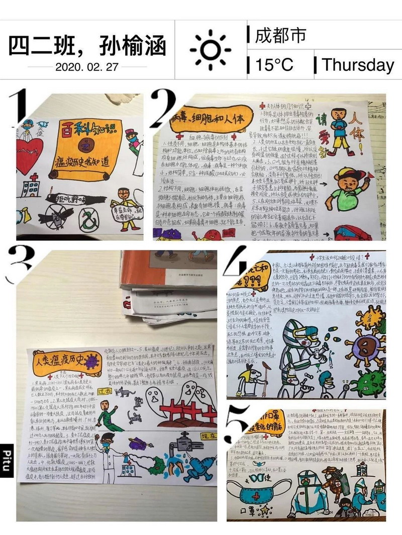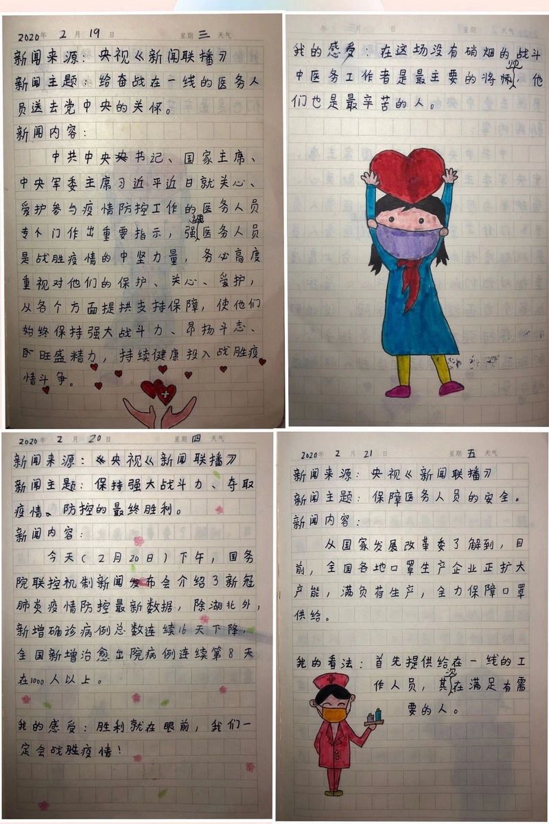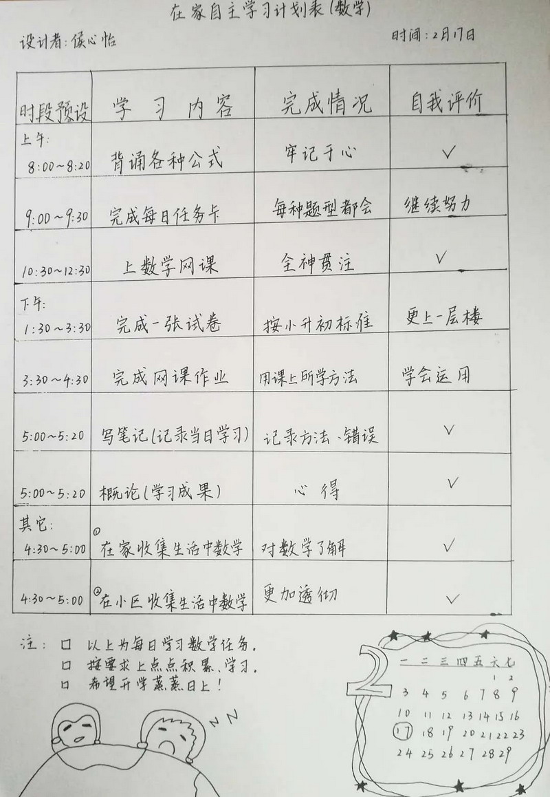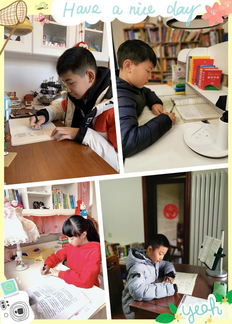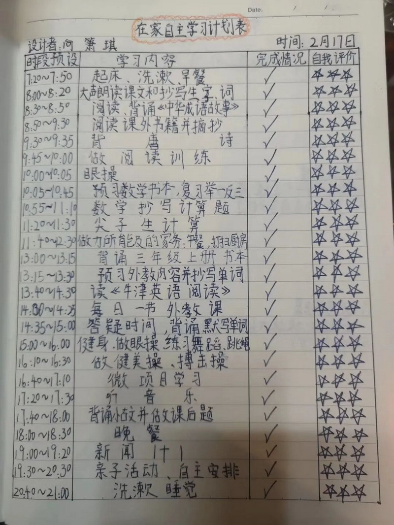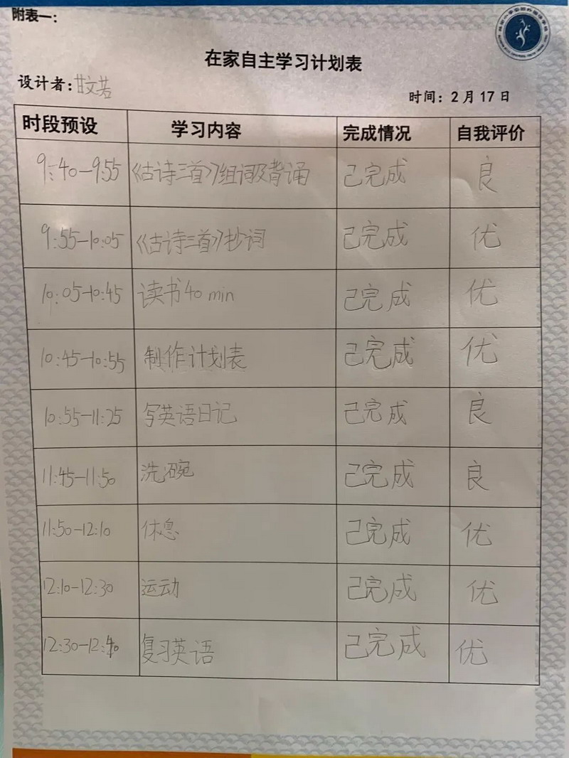 亲爱的孩子们,时间过得真快,两周的自主学习结束了,虽然少了老师在身边督促,但你们的表现棒棒的!在此,老师为你们点赞!从两周的学习中,我们看到了你们每个人都制定了严谨可行的学习计划,每天严格按照老师发布的延时开学任务卡,认真完成各项学习任务,德智体美劳全面发展。