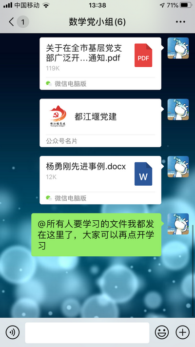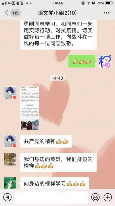 In order to further inspire the party members of our school to have firm confidence, maintain their determination, practice their original mission with more high morale, and win the victory of epidemic prevention and control, our school branch, with the Party group as the unit, organized all the party members to carry out the party day learning activity with the theme of "show loyalty in the face of crisis, show responsibility in the face of challenge", guided the party members to learn from the advanced models around through online learning, exchange and discussion ,to form a strong atmosphere of advocating the advanced and thinking of all the talents.