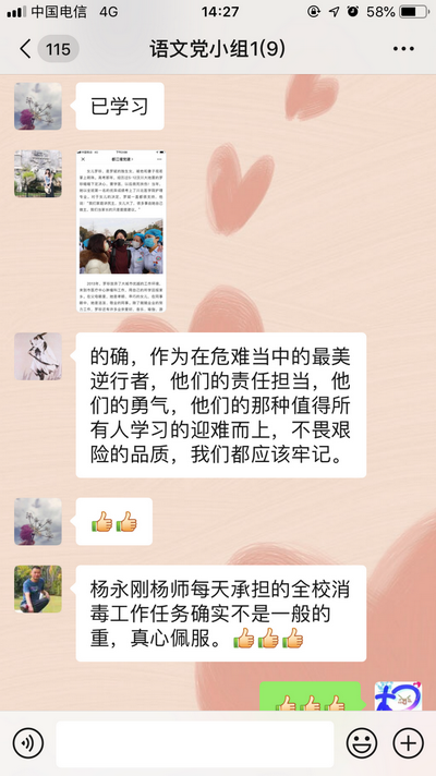 为进一步激发我校党员坚定信心、保持定力,以更加昂扬的斗志践行初心使命,夺取疫情防控胜利,我校支部以党小组为单位,组织全体党员开展“危难面前显忠诚,挑战面前显担当”主题党日学习活动,通过线上学习交流讨论,引导广大党员向身边先进典型学习,形成崇尚先进、见贤思齐的浓厚氛围。