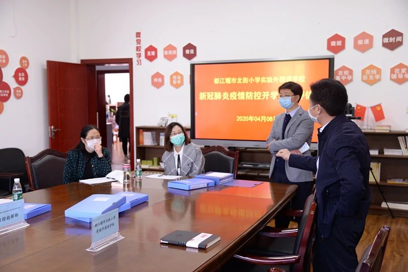 2020年4月8日14:00,都江堰市北街小学实验外国语学校迎来了都江堰市教育局新冠肺炎疫情防控指挥部联合评估小组的专项督查。
