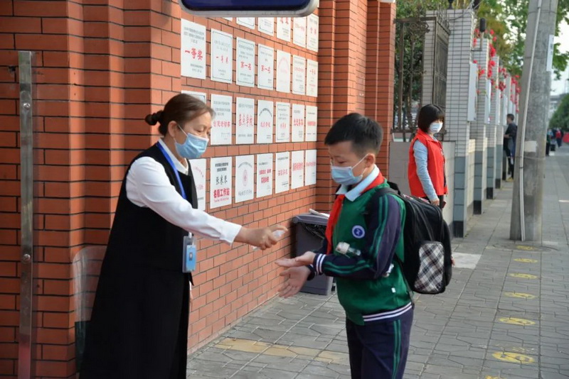 在值周老师的引导下,学生排队进行手消,进入红外线测温通道,保持前后1米间距。