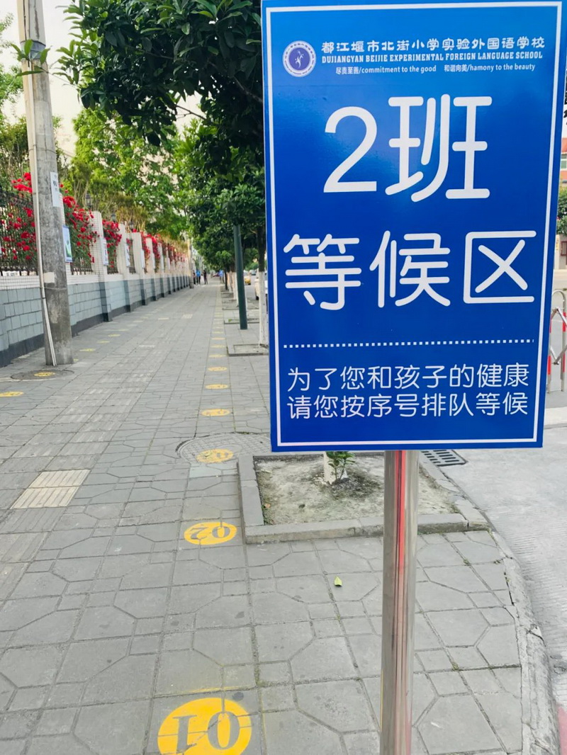 放学时,同学们按照学号排队,自觉间隔一米,家长们站在校门外两侧指定地点相对应的点位上,与孩子的站位一一对应。家长接到孩子后,有序离开。
