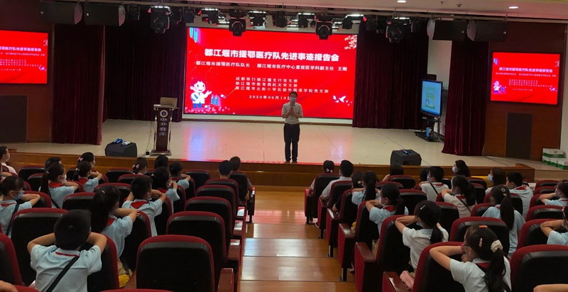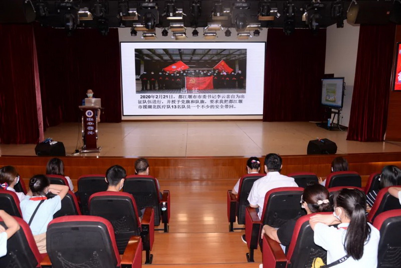 The motherland is the most solid support of the people, and the hero is the brightest coordinate of the nation. In the morning of June,10th,Wang Gang, the captain of our city’s medical team for aid to Hubei and the deputy director of the Department of Critical Care Medicine of Dujiangyan Medical Center, was invited by the Party Branch of the Dujiangyan Education Bureau, the Party Branch of the Bank of Chengdu Dujiangyan Branch and the Party Branch of our school to report on the work of teachers, students and staff. He recounted the retrograde deeds of the Dujiangyan City Aid Medical Team.
