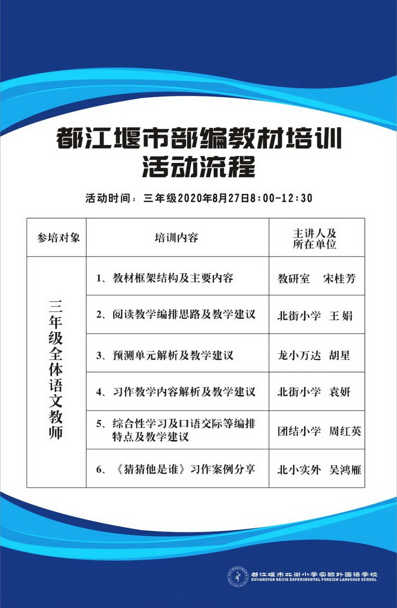 The new textbook compiled by Ministry has been fully used. In order to let teachers have a deeper understanding of the textbook and optimize classroom teaching, on the morning of August 27, the training activity of "Interpreting the textbook compiled by the Ministry and implementing the core literacy" organized by teaching and research section of Dujiangyan Education Bureau was held in our school. The teachers who are about to enter the third grade of Chinese teaching in the city attended the meeting.