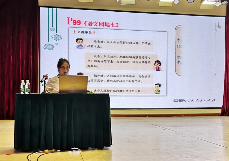 Wang Juan, a teacher from Beijie Primary School, brought a lecture entitled "Reading teaching arrangement ideas and teaching suggestions".