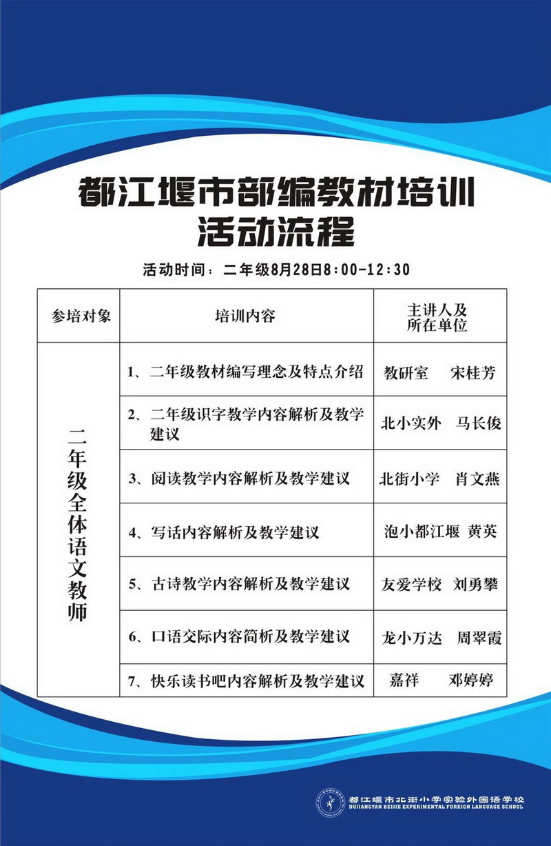 为了更深入地钻研部编本语文教材,促进老师们更好地使用教材,8月28日,都江堰市教育局小学语文教研室组织的“解读部编教材,落实核心素养”都江堰市二年级语文教材培训活动在我校举行。