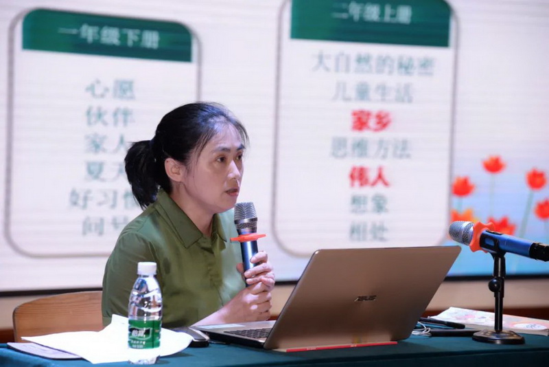 First of all, Song Guifang ,a teaching researcher of Dujiangyan analyzed "the second grade textbook compilation concept and characteristics".