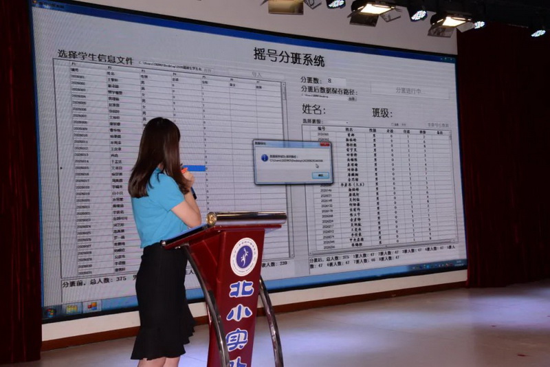 第一阶段:由徐然林老师操作电脑系统随机分班(包括3位教师子女),四位家委会成员上台监督,阿蓓老师为家长们讲解系统分班情况。紧张的五分钟过去,8个班的名单随机产生,从结果看,每个班男女生比例恰当、住读走读分配均匀。徐老师现场打印8个班的名单并立即交给督查活动的家委会成员,由他们张贴到各班教室。