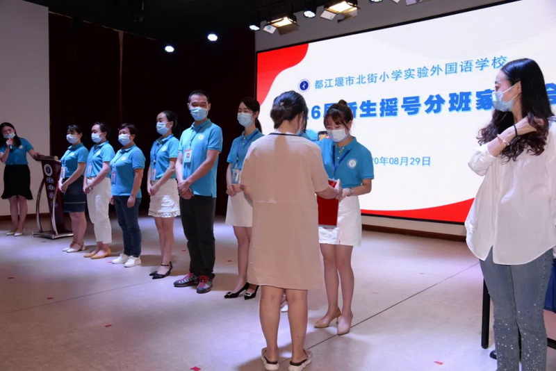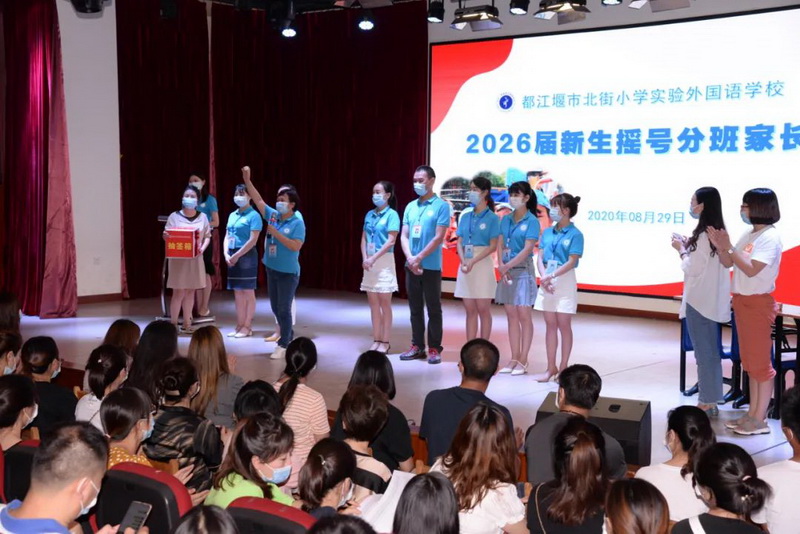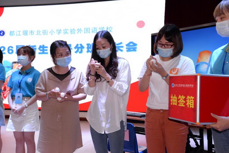 第二阶段:各班主任入场,主持人随机邀请在场的3位家长上台将未拆封的乒乓球编上号(1-8),由1位家长持抽签箱,将编好号的乒乓球纳入箱子并摇匀,八位班主任随机抽取一个乒乓球并现场公布执教班级。