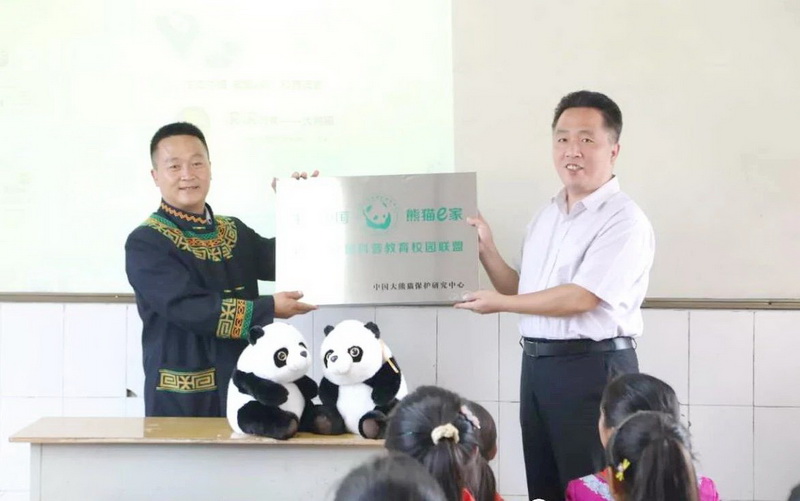 Liu Weiping, member of the Party committee and deputy director of the China giant panda conservation and Research Center, awarded the "e family of ecological pandas" - the name plate of "Panda science popularization education alliance" to Daba Primary School.