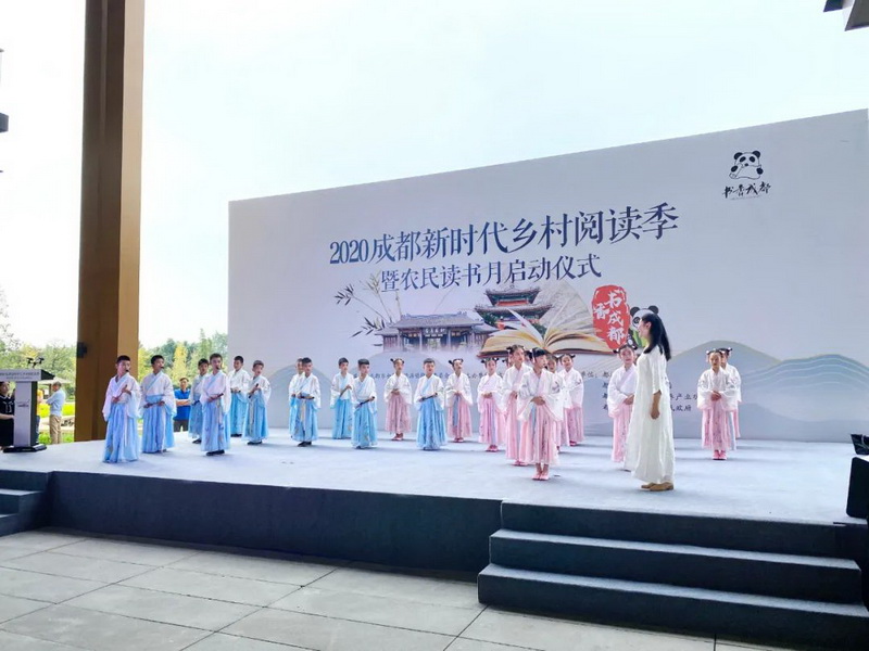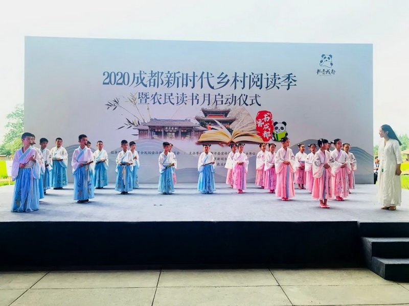 腹有诗书气自华,最是书香能致远。在推进全面阅读的过程中,成都把书香文化传递到了城市乃至乡村的各个角落,为加快建设世界文化名城提供着强大精神动力和文化滋养。2020年9月8日上午,由成都市全民阅读活动指导委员会指导,成都市委宣传部主办的“2020成都新时代乡村阅读季暨农民读书月启动仪式”在都江堰灌区映像正式举行。我校杨凤娟老师领着一群三年级小朋友身服华饰,川音浓浓,韵味十足地诵读了一首《青城谣》为此活动拉开了帷幕。杨老师和孩子们朗朗吟诵声,引起了阵阵掌声,受到大家的高度赞扬!