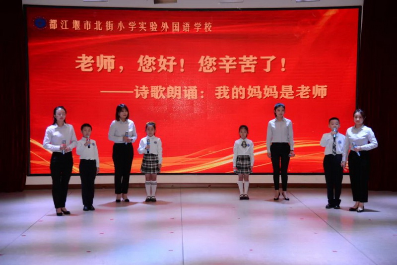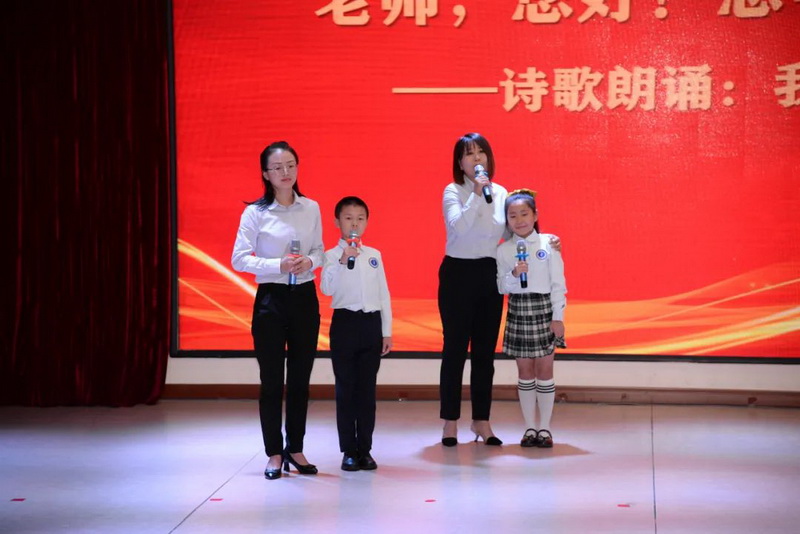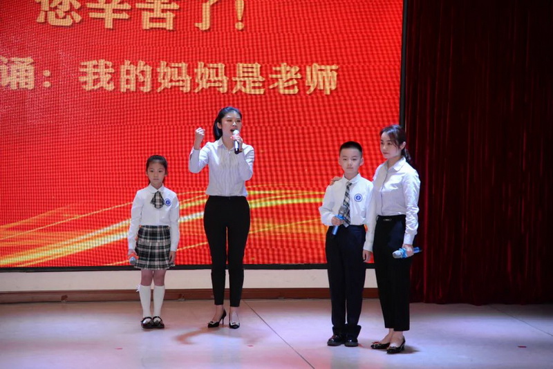 9月11日下午,送走了亲爱的孩子们,教师节庆祝活动暨表扬大会在一首《我的妈妈是老师》诗歌朗诵中拉开帷幕。On the afternoon of September 11, the dear children were sent away, and the Teacher's Day celebration and praise conference opened in a poem recitation of My Mother is a Teacher.