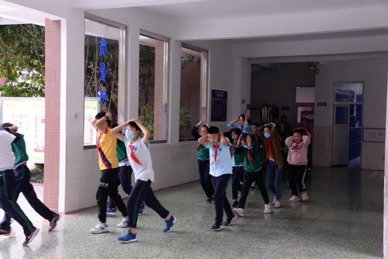 全校师生进入防空演练准备状态,网格执勤教师迅速到位。